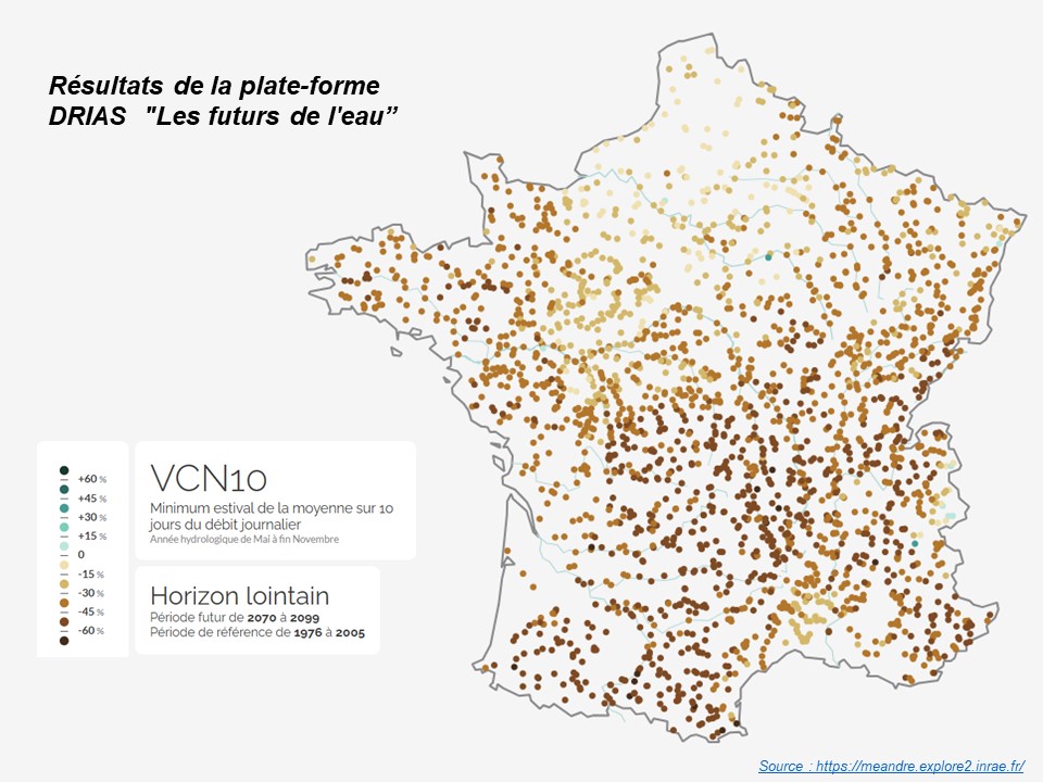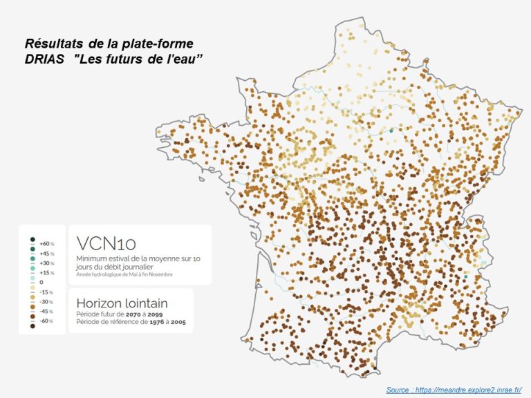Depuis 2019, les travaux du GIECLe GIEC (Groupe d’experts Intergouvernemental sur l’Evolution du Climat), créé en 1988 par les Nations Unies, évalue l’état des connaissances sur l’évolution du climat, ses causes, ses impacts. et de la communauté scientifique française (avec notamment Météo France, l’INRAEInstitut National de Recherche pour l’Agriculture, l’Alimentation et l’Environnement, OFBOffice Français des la Biodiversité, Agences de l’Eau…) ont largement fait progresser la connaissance et les trajectoires des différentes projections climatiques ont été affinées. Sur la thématique de la ressource en eau, la conclusion en 2024 de l’étude Explore2Étude portant sur l’impact du changement climatique sur la ressource en eau et la création du portail DRIAS-les futurs de l’eau a permis la mise à disposition d’un corpus de données très conséquent : évolution des principaux paramètres hydro-climatiques ou agro-climatiques pour différents horizons temporels, selon différentes hypothèses d’émission de CO2, avec une résolution spatiale fine.